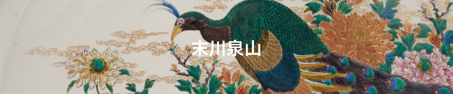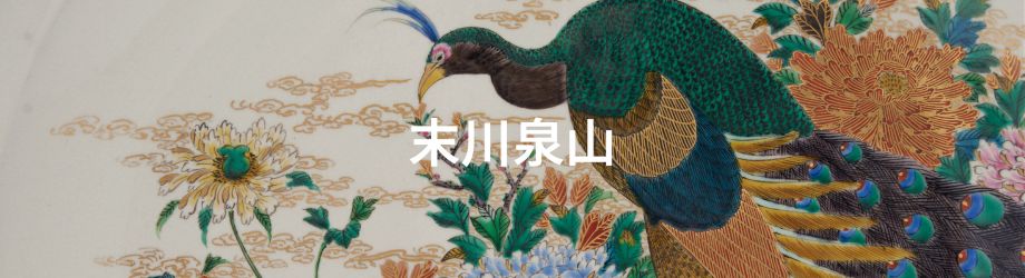 末川泉山は、三代にわたりつづく寺井の絵付作家であり、人物・花鳥・楼閣・山水を得意としてきました。初代末川泉山(末川米吉・1871~1928)は明治から大正にかけて寺井で活躍した名工の一人で、九谷庄三の弟子・西村某(白樹か?)に師事していました。同輩には九谷焼作家兼日本画家の笠間竹雪がおり、彼の工房にも出入りしていました。初代の長子として生まれた二代末川泉山(末川恒義・1897~1959) は、幼くして笠間竹雪に師事し、酉年生まれであることから、鶏、孔雀、鳳凰、金鶏を得意としていました。三代末川泉山(中川鉄男・1929~2011)は二代の甥にあたり、陶芸家・森一正に師事しながらも、先代の業を受け継ぎ、日展や現代美術工芸展に創作的な作品を出品し、本県九谷業界の中堅として知られていました。歴代末川泉山が師事した西村某(白樹か?)・笠間竹雪・森一正の系譜を遡ると、寺井を代表する九谷焼作家・九谷庄三の教えや技術・手法などを受け継ぎ、または取り入れた作家たちであり、末川泉山もその継承者の一人といえます。そのため、作品名にも含まれているように、「庄三風」の画風が大きな特徴です。