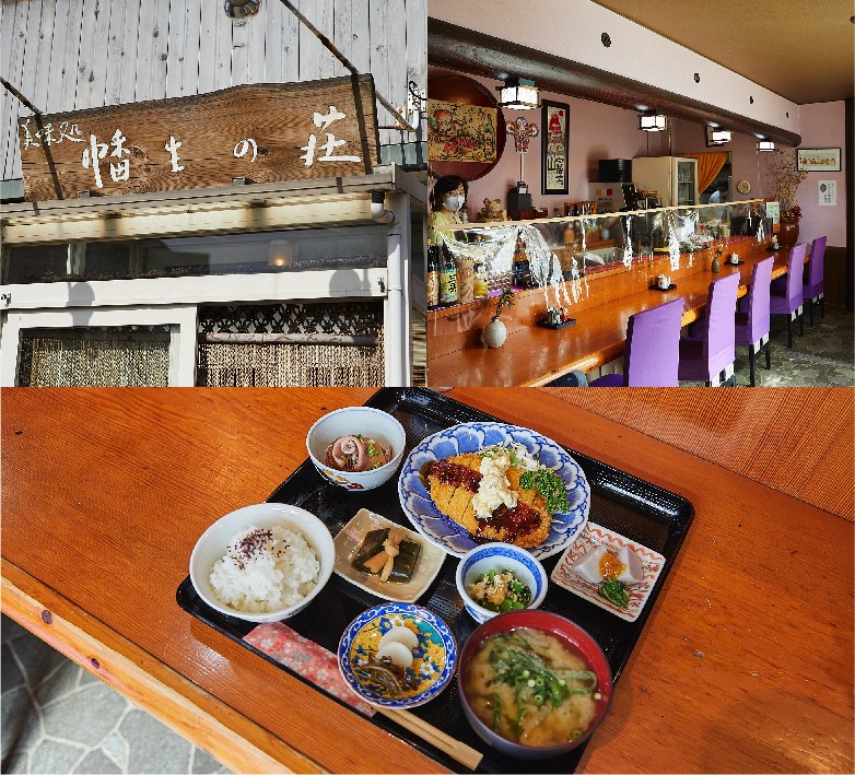 奈良時代、この地に幡生荘という荘園がありました。そんな古風な名前がふさわしい、落ち着いた雰囲気の居酒屋が店を構えたのは1988年。日本海のおいしい魚、地元の新鮮な野菜(吉川農園さんから仕入れています)で、しっかり手間をかけた料理を提供しています。お店を切り盛りするおかみさんと弟さん夫妻、3人の優しく明るい人柄とおいしい料理に惹かれ、ランチには近くの会社員や大学生でいつも賑やか。夜は、噂を聞きつけてわざわざ金沢から足を運ぶ人もいるとか。お忍びで、俳優さんや作家さんが訪れることもあるそうですよ。