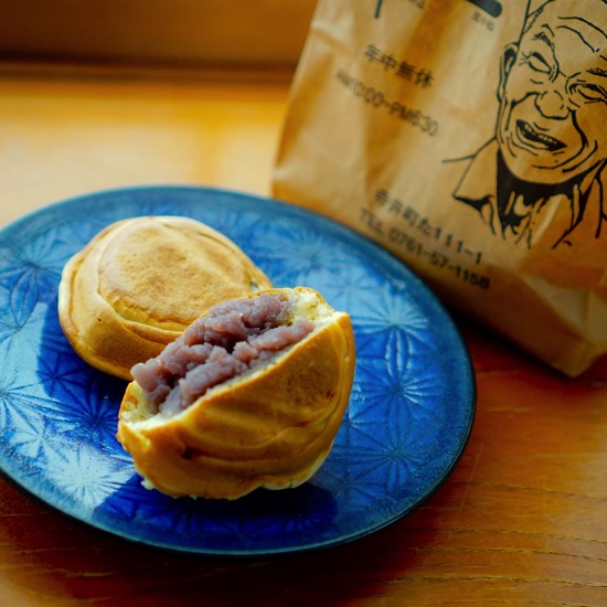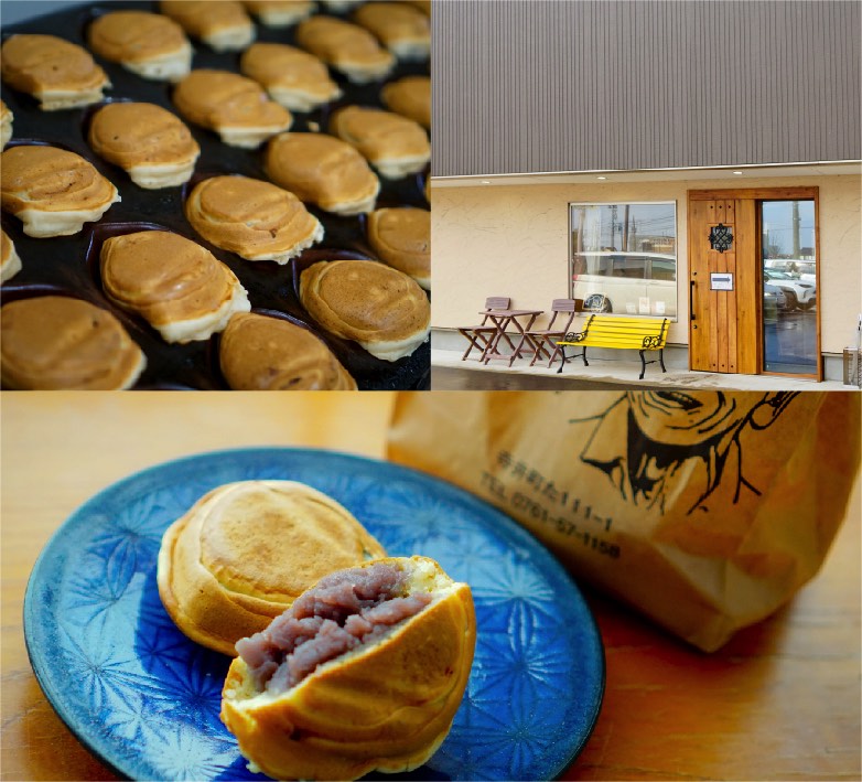 栗の形をした小ぶりな焼万頭。ひと口頬張れば、こし餡の優しい甘みが口いっぱいに広がります。「昭和の初め頃、祖父が焼万頭の屋台を始めて、南加賀各地のお祭りで販売したのがルーツです」と3代目の由田さん。縁起物の「勝ち栗」をかたどった焼万頭は行く先々で人気を集め、たちまち行列店となりました。今も材料や製法を一切変えることなく銅板で一つ一つ手焼きしており、初代が屋台でふるまった頃の味そのままの懐かしい味わいを守っています。店頭で焼きたてのパリッとした皮と熱々の餡をハフハフ味わうのも良し。少し冷めた頃に、皮のもっちり食感と餡の際立つ風味を楽しむのもまた良し。一つ、また一つとやめられない美味しさです。