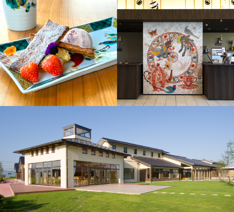九谷焼作家がプロデュースするホテルに併設されたカフェ&レストランでは、地元の新鮮な食材を使った料理やスイーツをすべて九谷焼の器で提供。五感が喜ぶひとときを過ごすことができます。