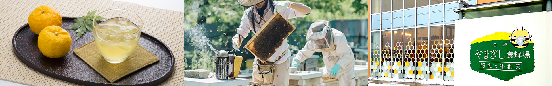蜂蜜の優しい甘さと柚子の爽やかな酸っぱさがクセになる蜂蜜ドリンク「加賀柚子みつ」。昭和5年(1930年)から養蜂を始めたやまぎし養蜂場の自慢の商品です。金沢の里山で初代がミツバチを1群分けてもらったのが始まりで、二・三代目が生産地の環境や蜂蜜の品質、安全性にこだわって養蜂場を受け継いできました。