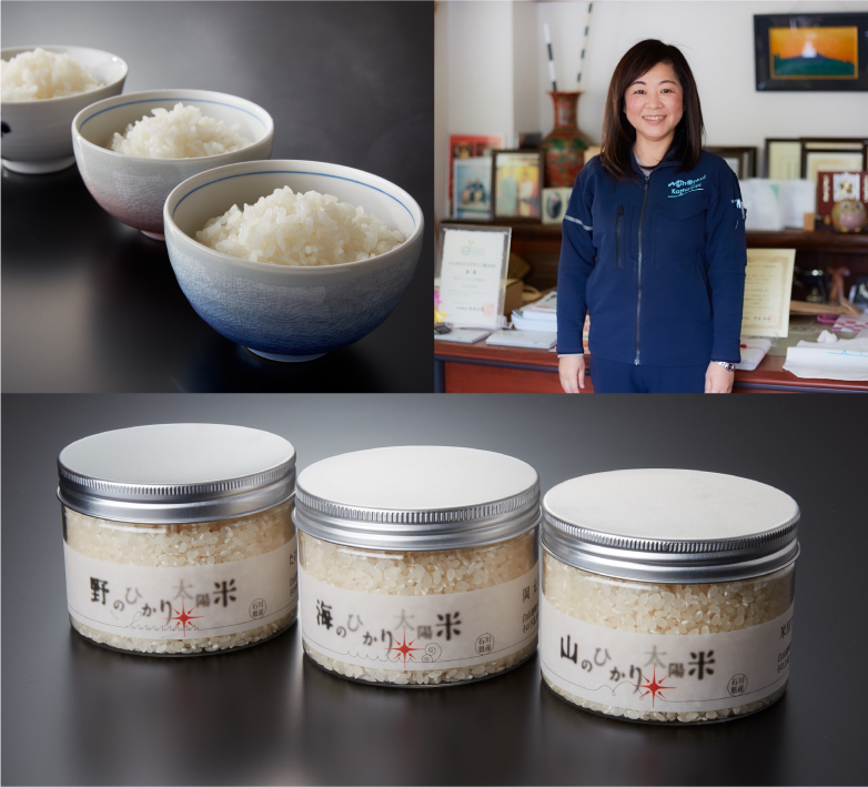 剪定枝や調理前の給食残渣を発酵させ作った有機肥料、さらにそれを使って生産した農産物からの商品開発・販売など、 “資源再生による循環型ビジネス”に取り組んでいます。植物由来の有機肥料「ひかり太陽」を使い、土壌に含まれる菌や微生物を活性化させた土づくりを経て稲作が行われ、その有機肥料で生産されている「ひかり太陽米」を使用した白米や玄米のギフト商品もあります。「いしかわエコデザイン賞2020」で、地域に根差す循環型ネットワーク『能美をフィールドとした資源再生へ』で金賞を受賞しました。