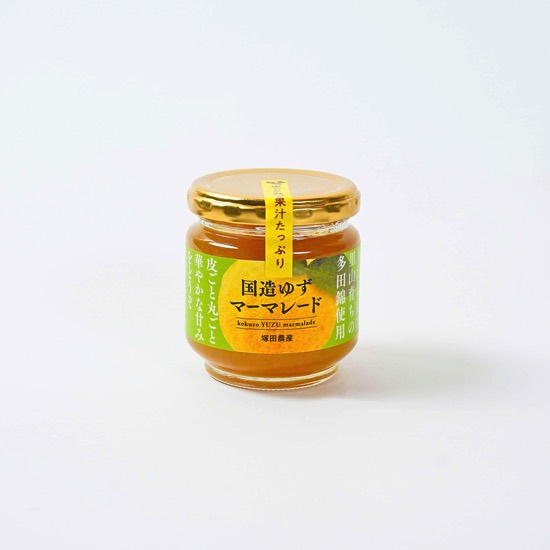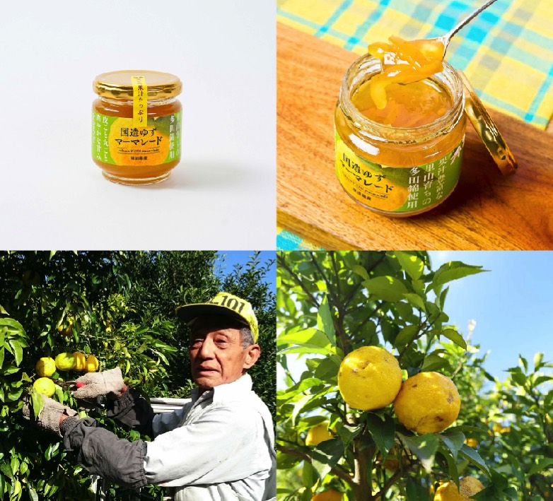 国造地区で生産される柚子の品種は2種。1つは一般的な大きさで中にタネがある「木頭」で、こちらは果汁分18%ほど。もう1つは小ぶりで皮が薄くタネもなく、果汁が30%ほども含まれる「多田錦」です。この甘酸っぱくて美味しくジューシーな多田錦を使った柚子マーマレードが好評です。