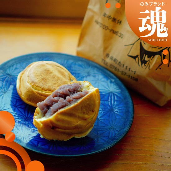 栗の形をした小ぶりな焼万頭。ひと口頬張れば、こし餡の優しい甘みが口いっぱいに広がります。「昭和の初め頃、祖父が焼万頭の屋台を始めて、南加賀各地のお祭りで販売したのがルーツです」と3代目の由田さん。縁起物の「勝ち栗」をかたどった焼万頭は行く先々で人気を集め、たちまち行列店となりました。今も材料や製法を一切変えることなく銅板で一つ一つ手焼きしており、初代が屋台でふるまった頃の味そのままの懐かしい味わいを守っています。店頭で焼きたてのパリッとした皮と熱々の餡をハフハフ味わうのも良し。少し冷めた頃に、皮のもっちり食感と餡の際立つ風味を楽しむのもまた良し。一つ、また一つとやめられない美味しさです。